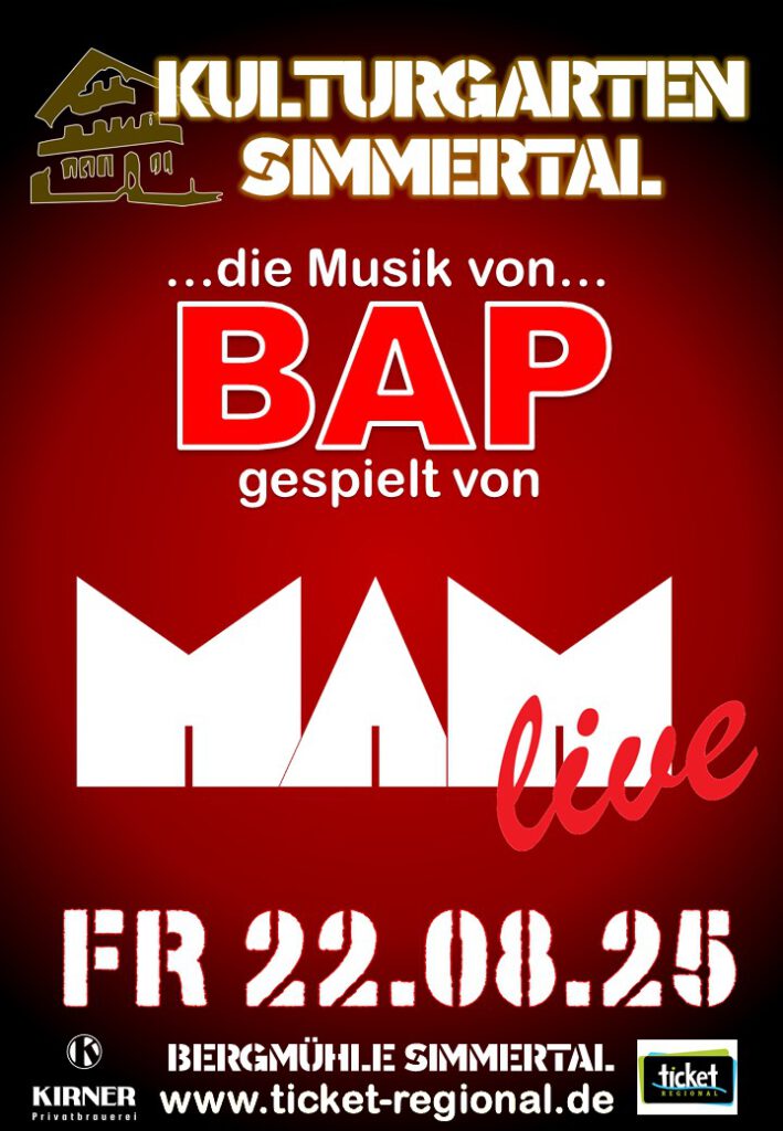 Am Freitag den 22.08.2025 ist die Kölner BAP Tribute Band MAM beim Kulturgarten auf der großen Open Air Bühne zu sehen.